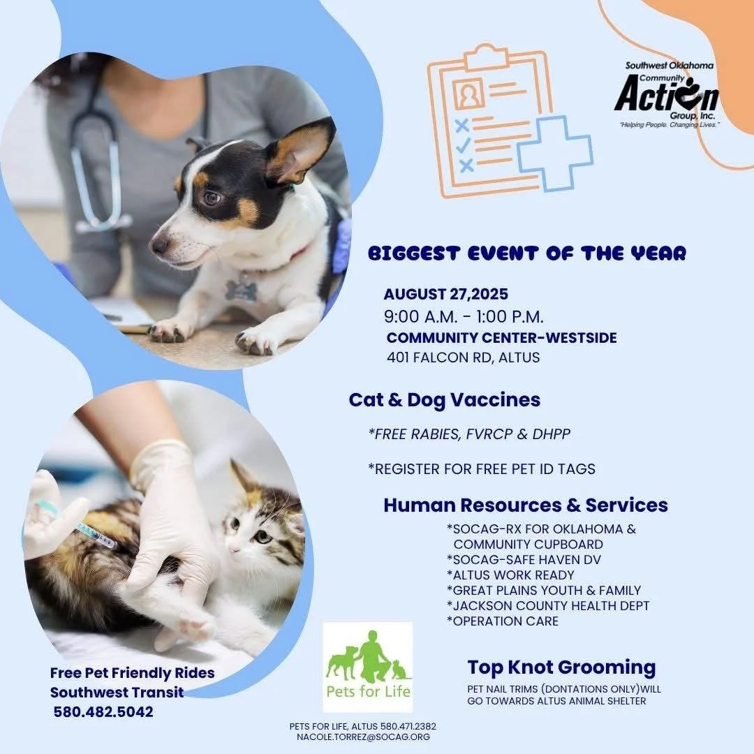 SOCAG is hosting its Biggest Event of the Year on August 27, 2025, at the Community Center–Westside in Altus. Families and their pets are invited for a day of free vaccines, pet ID tags, nail trims, and pet-friendly rides—plus access to essential community resources from local partners. This event is about more than pet care; it’s about neighbors coming together to support one another.